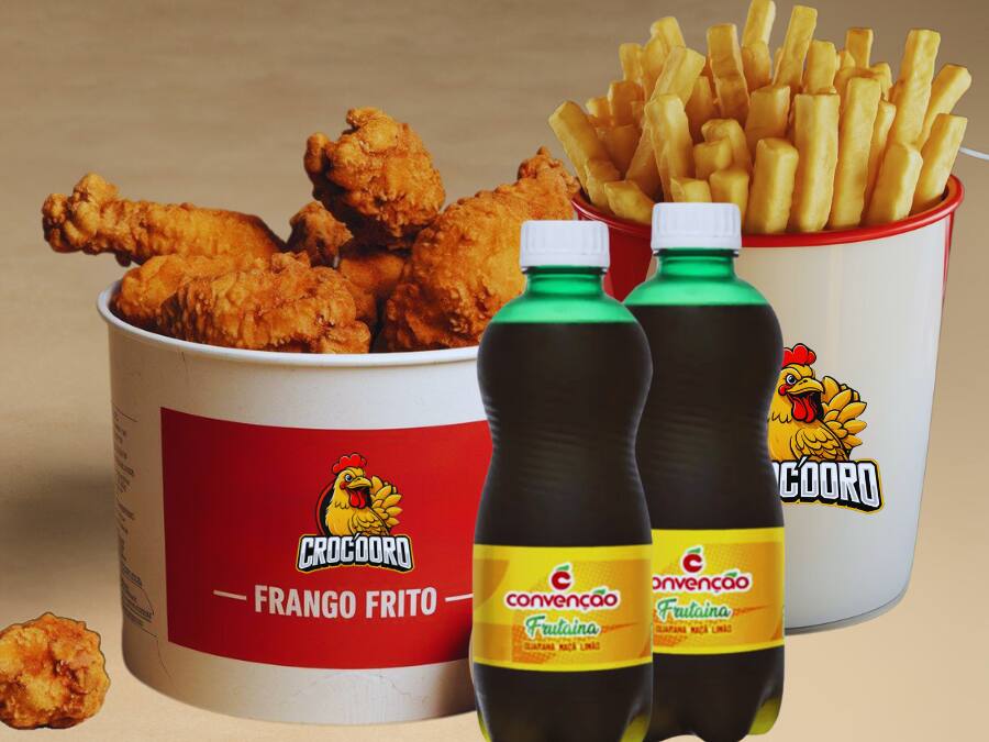 Combo Telecine - 400g de Frango Frito + 500g de Batata Frita cobertas com cheddar, acompanhado de 2 refrigerantes Convenção 350ml. Tudo em duas maletas: uma com a batata crocante e outra só com o frango.